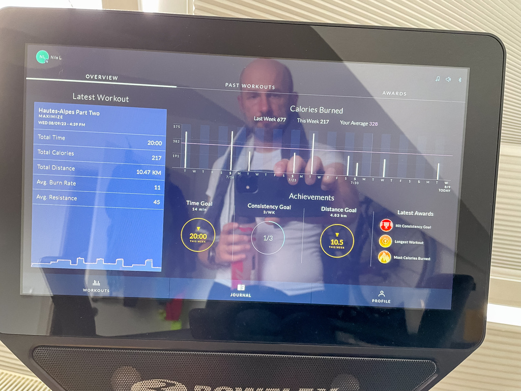 Das mit dem Schwitzen änderte sich in den nächsten zwei Monaten übrigens nicht mehr. Die Trainingseinheiten forderten mich stets und es machte Spaß sie durchzuziehen. Besonders die verschiedenen Intensitäten innerhalb der Trainings waren eine schöne Abwechslung zum Laufen. Unter normalen Umständen und ohne die strengen Augen der Maschine sowie deren Auswertung der Ergebnisse wäre ich sicherlich nicht so an meine Grenzen gegangen. Die Trainerinnenstimme trieb mich jedes Mal ordentlich an, auch wenn die sehr amerikanischen Kommentare sich über die Zeit erschöpften („Time to Shine“). Und imaginäre Awards gibt es natürlich auch. Auch die schönen Landschaftsvideos trugen sicherlich zum abwechslungsreichen Fahrerlebnis bei.